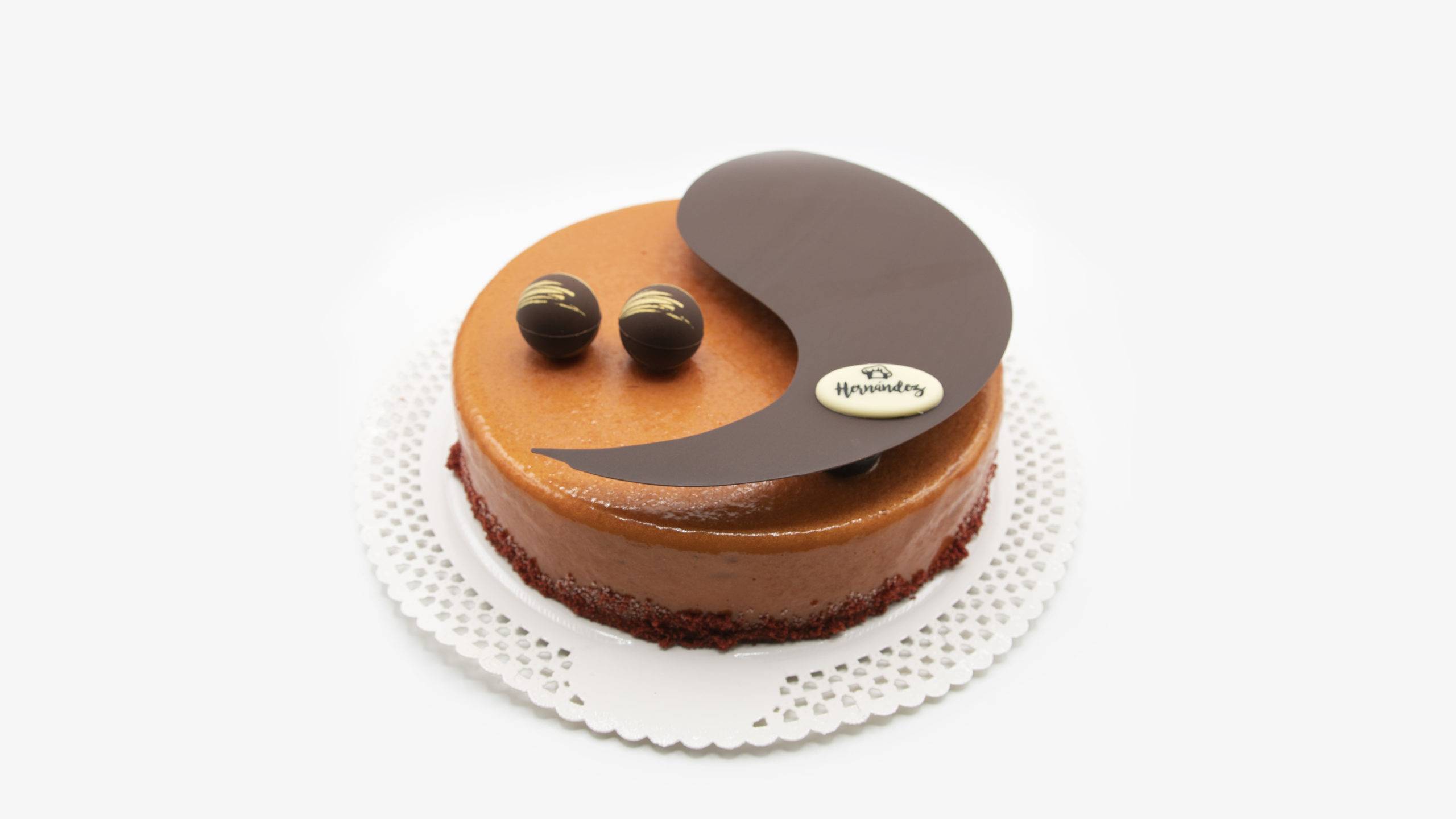 Bizcocho húmedo de chocolate con corazón de mango y mousse de chocolate con leche. 1kg aprox.