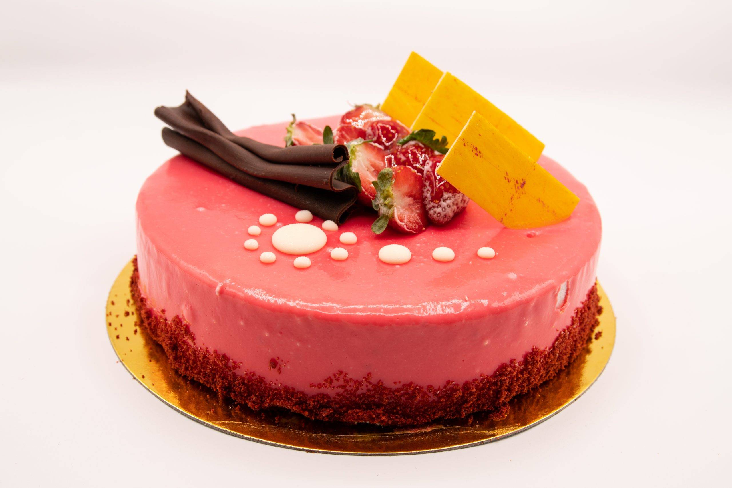 Bizcocho, mousse de fresa y brillo de fresa. Peso aprox: 1Kg.