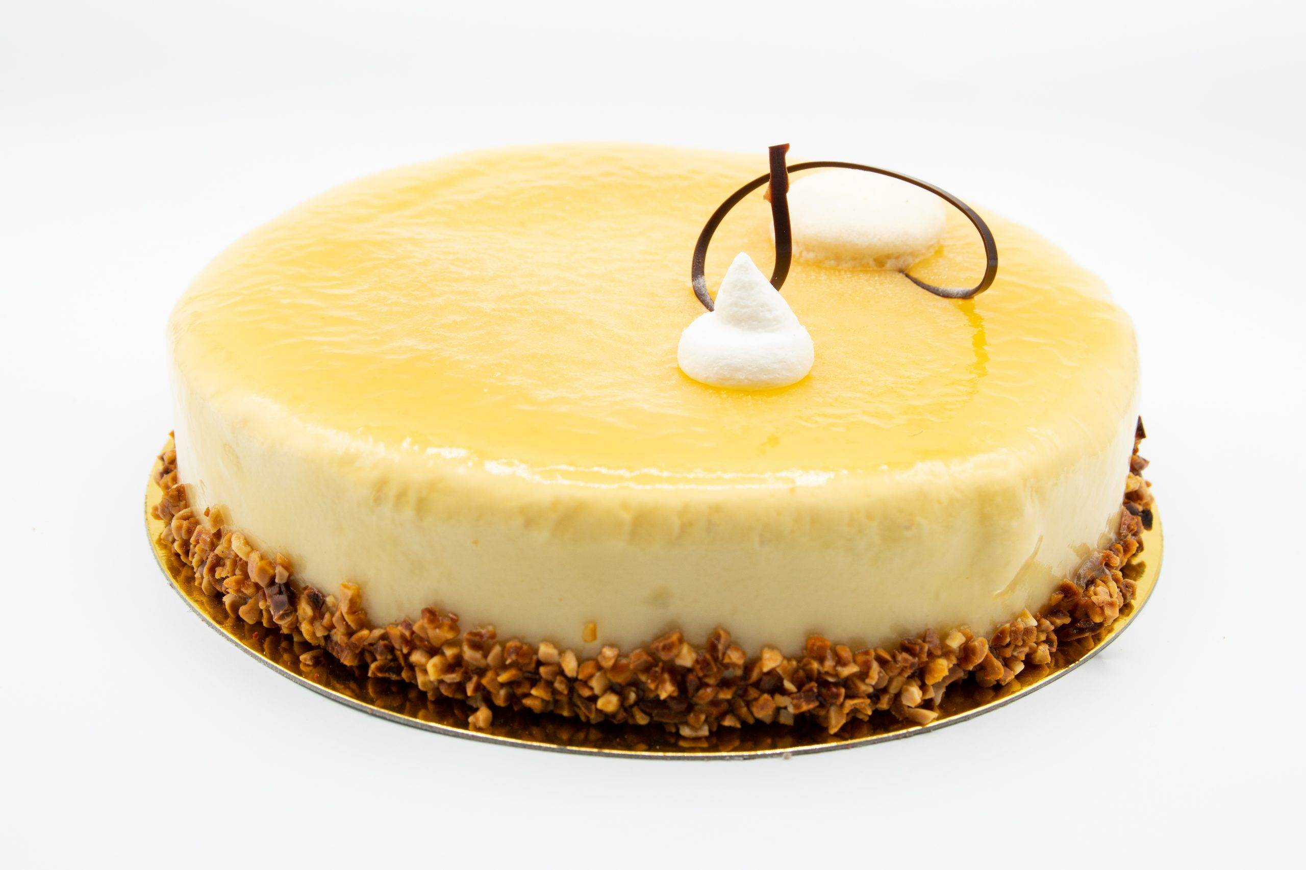 Bizcocho calado en Whisky, yema tostada, mousse de Whisky y crocanti de almendra. Peso aprox: 1Kg.