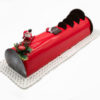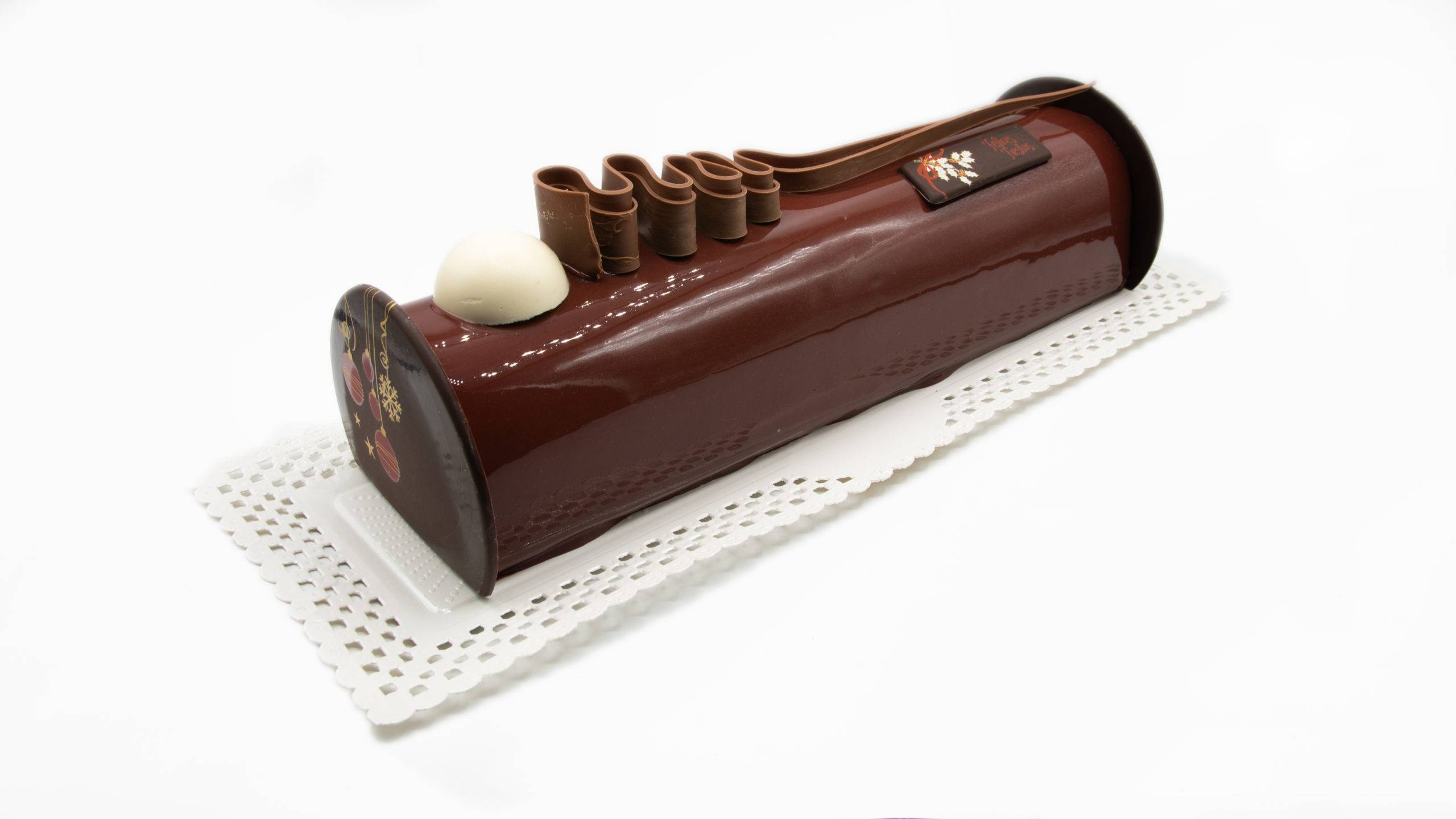 Base crujiente de chocolate con leche, corazón de ganache (trufa) de pasión y mousse de chocolate intenso 60& y cubierta de glaseado de chocolate brillo. 1,1Kg Aprox.